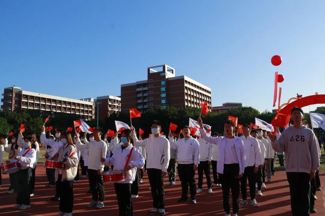 飘扬在体育场上空。全体校领导与师生面向国旗,共唱国