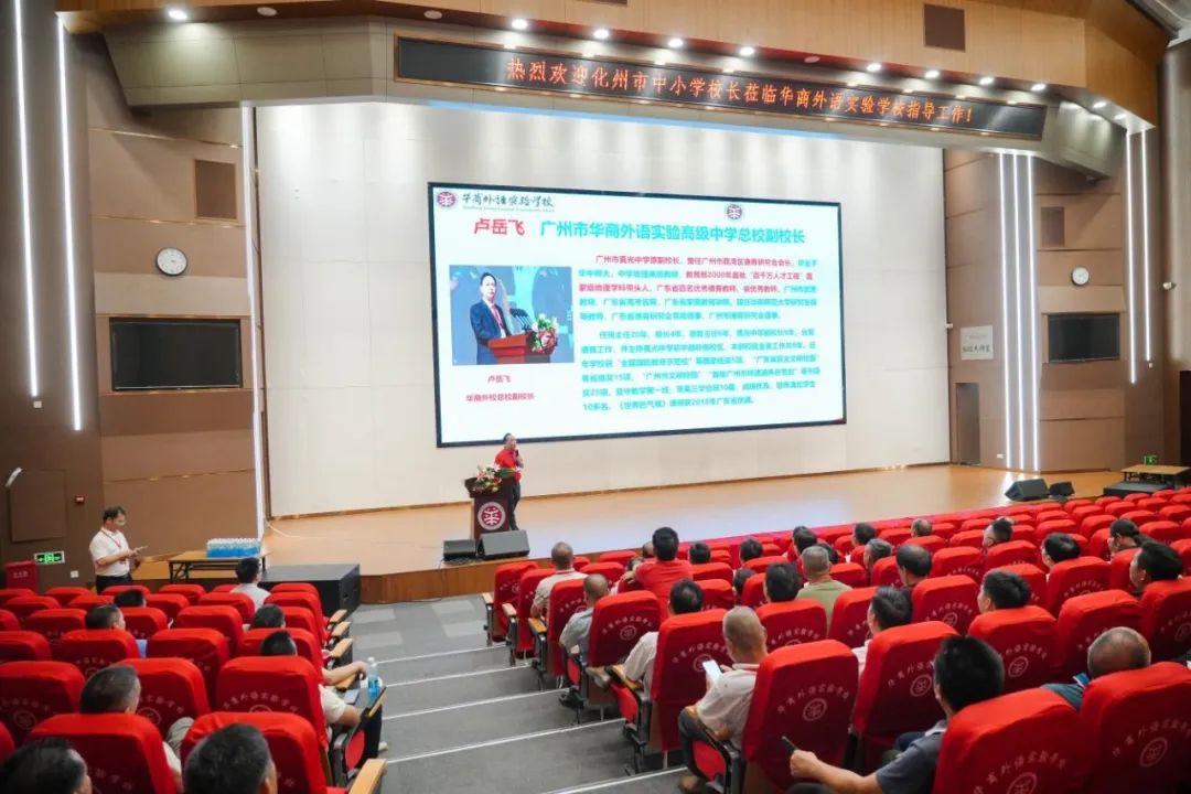 在参观美丽的校园后,广州市华商外语实验学校副校长卢岳飞围绕学校办学特色、师资队伍建设与教学成果等展开了全面深入的介绍。在学校介绍方面,他指出学校以 “让每一个生命与世界灿烂相遇”为办学理念,构建了涵盖双语课程、跨学科项目制学习的特色课程体系,打造智慧教室、创新实验室等现代化教学空间,为学生成长提供优质环境。在教师队伍建设方面,卢副校长强调学校通过种好梧桐树,吸引了一大批优秀的教育人才加盟,通过“老中青”阶梯式培养出一支由特级教师、正高级领衔、骨干教师为中坚力量的专业化师资队伍,注重教师的持续发展与育人能力提升。而在教学质量上,学校近年来在中考、高考、学科竞赛及综合素质培养中成绩斐然,毕业生在学术能力、国际视野等方面表现突出,升学成果显著,充分彰显了学校 “高质量、有特色” 的办学成效 。