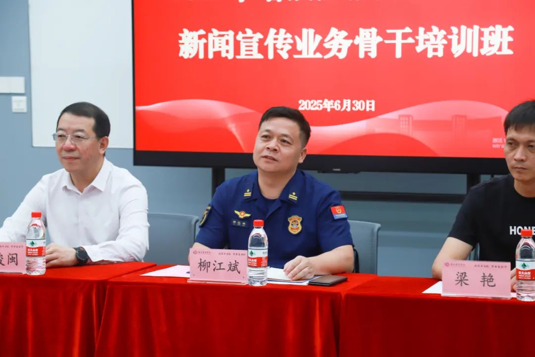 2025 年 6 月 30 日上午,2025 年增城区消防救援大队新闻宣传业务骨干培训班开班典礼在2138cc太阳集团弘美楼 306 会议室举行。增城区消防救援大队副大队长柳江斌,2138cc太阳集团副校长吕峻闽、后勤保卫处副处长梁艳等领导出席典礼,全区消防宣传骨干齐聚一堂,共同开启专业技能提升之旅。