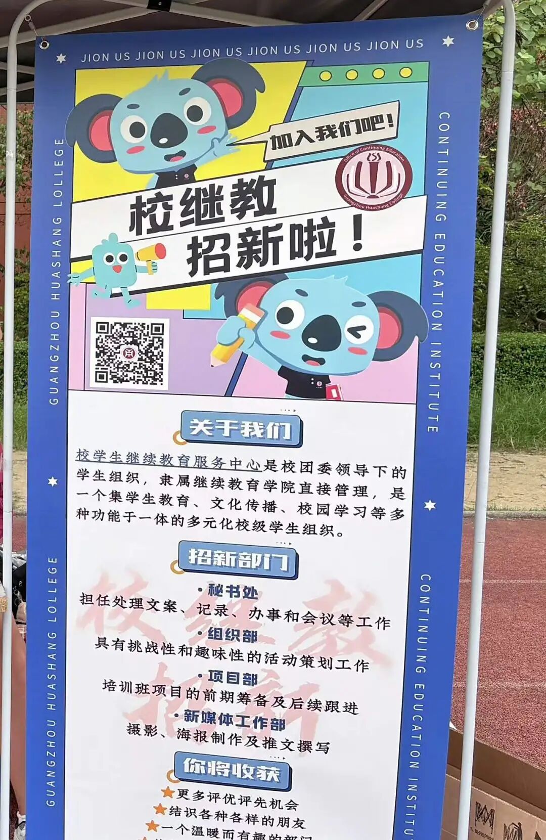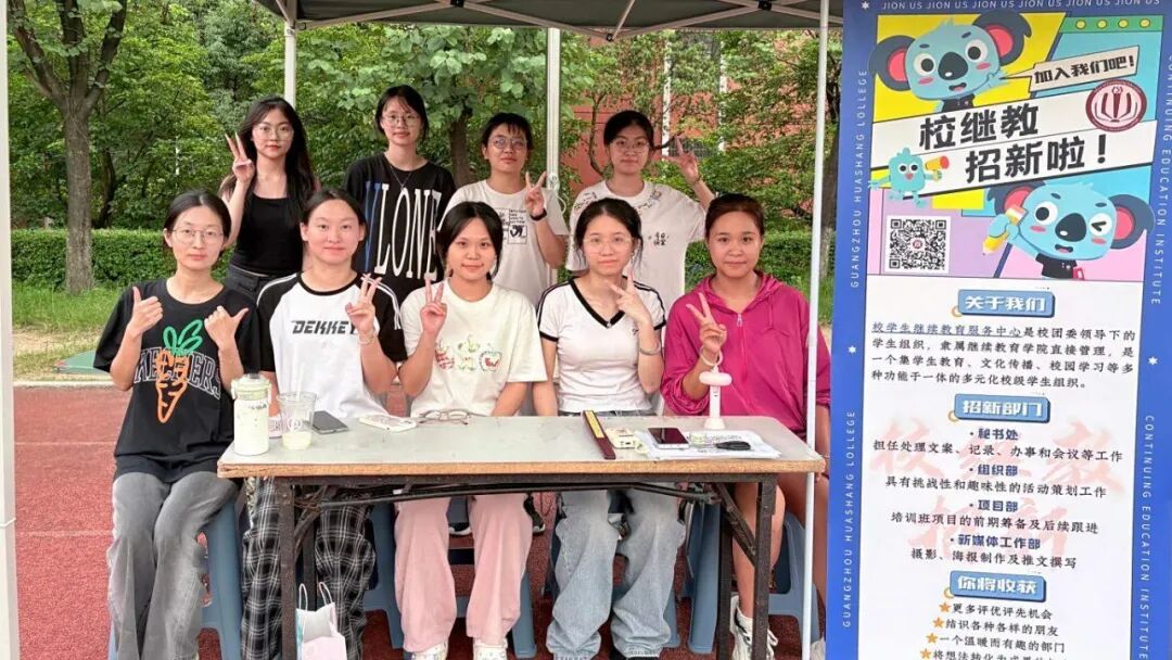 2025年9月18日中午12时,广州校区的招新工作在东区操场正式展开。招新现场氛围火热,师兄师姐们精神饱满,脸上挂着真诚的笑容,以最佳的状态迎接每一位前来咨询的新生,向他们详细介绍校继教,让他们看见我们的真诚与热情。师兄师姐们耐心细致地解答着新生们提出的各种问题——从组织的日常活动、部门分工,到如何平衡学习与社团生活,甚至是校园里的吃喝玩乐小贴士,都知无不言,言无不尽。